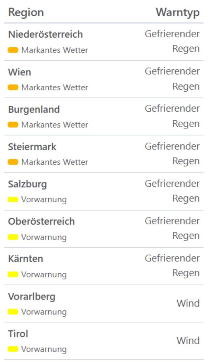 Experții de la Centrul pentru Fenomene Meteo Severe au emis avertizări pentru mai multe regiuni. În Austria Inferioară, Viena, Burgenland și Stiria este în vigoare un avertisment de cod portocaliu pentru „ploaie înghețată”. Pentru Salzburg, Austria Superioară și Carintia a fost emisă o prealertă, în timp ce în Vorarlberg și Tirol principala problemă o reprezintă vântul puternic.